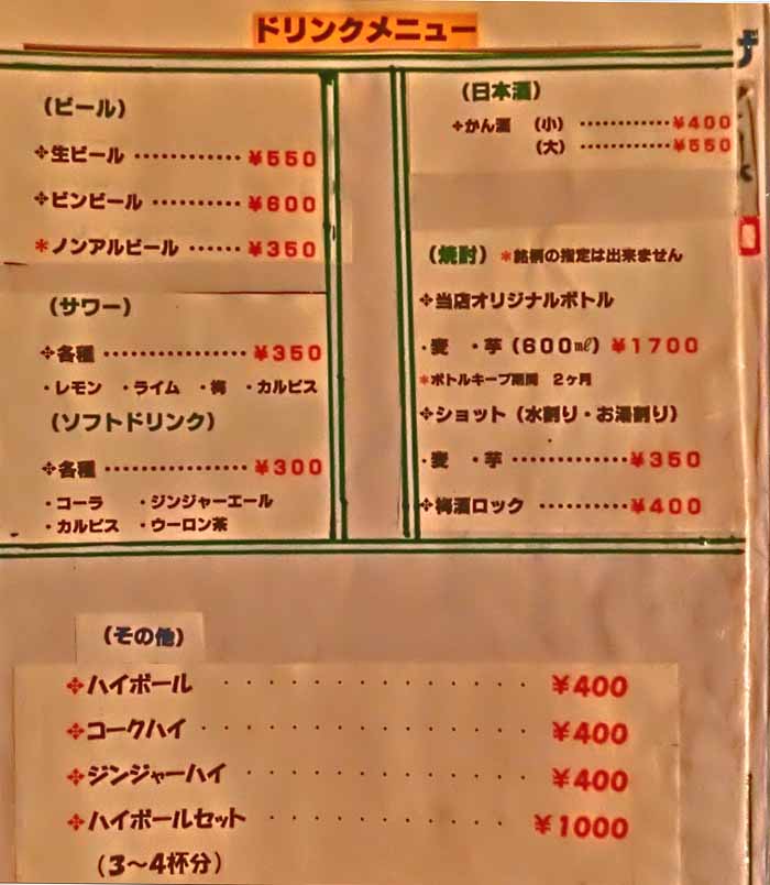 | 生ビール:550円 ウーロン茶:300円 ザクロサワー:350円 焼酎:2500円 | |