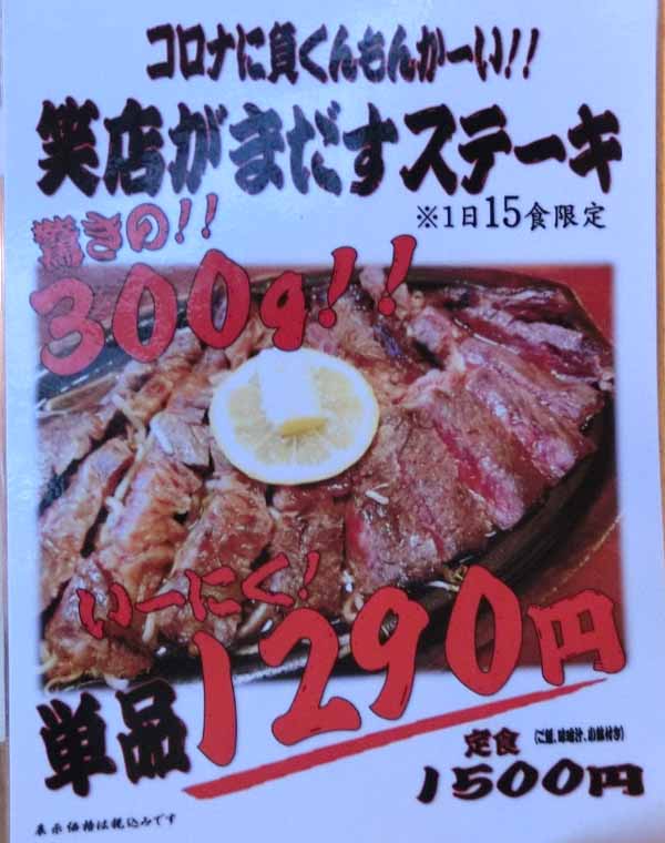 | 笑店がまだすステーキ定食/300g:1500円+ご飯大盛:100円 | |||||||||