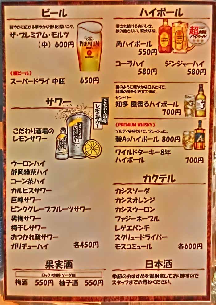 | 茜霧島(芋)デカンタ飲みきり400ml:1500円 静岡緑茶ハイ:450円 梅干サワー:450円 | |