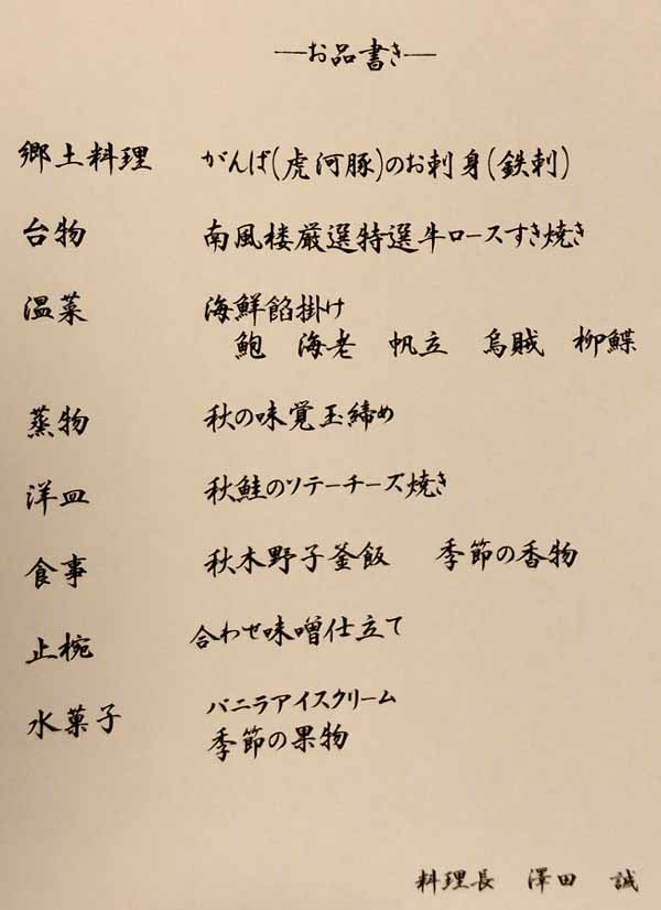 | がんば(虎河豚)のお刺身(鉄刺) 特選牛ロースすき焼き 海鮮餡掛け 秋の味覚玉締め 秋鮭のソテーチーズ焼き 秋木野子釜飯/季節の香物 合わせ味噌仕立て バニラアイス季節の果物 ![]() |