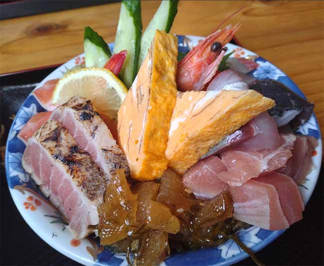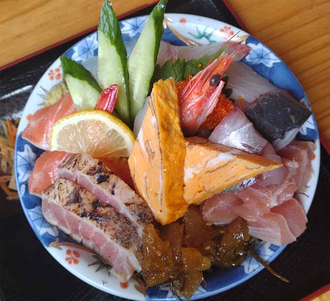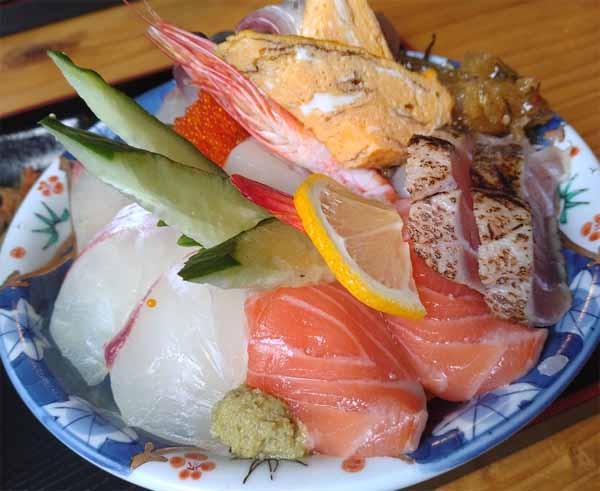 有頭海老、まぐろ、サーモン、タイ、ハマチ、マグロのタタキ、とびこ、ホタテ、アジ、松前漬、玉子焼 |