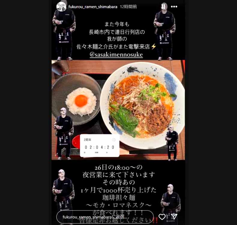| “‡Œ´ŽsV’¬1’š–Ú459@“d˜b090-7380-1265 11:30`14:00L.O./18:00`22:30i‹à“y—j19:00`2:00j@‹x:…—j¥‘æ2‰Î—j@P–³ https://www.instagram.com/fukurou_ramen_shimabara/ |