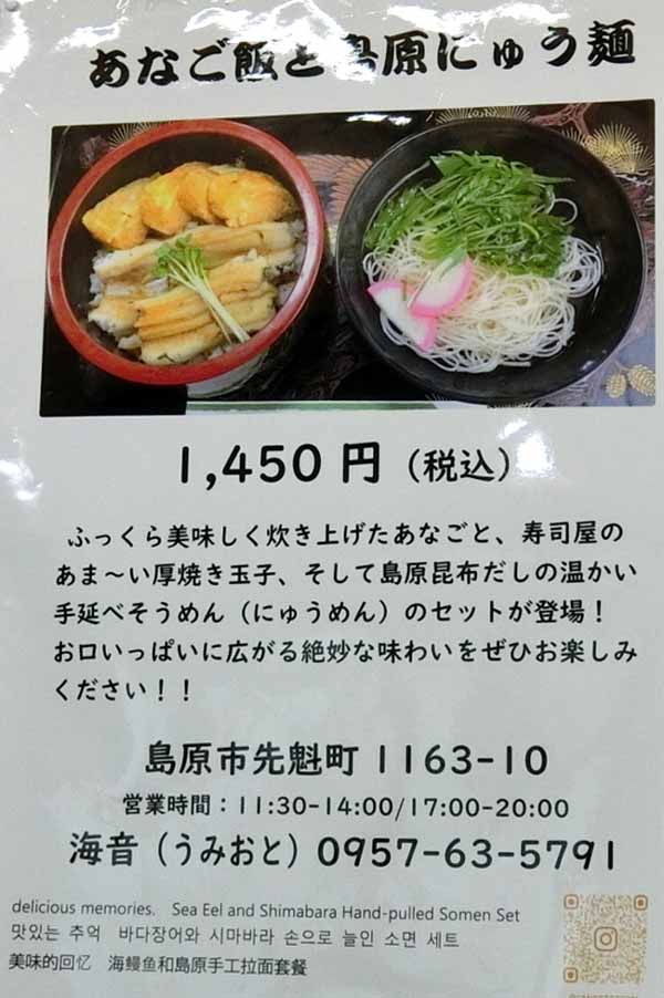 | 島原市先魁町1163-10 0957-63-5791 11:30〜14:00/17:00〜20:00 休:月曜 1993年6月9日OPEN https://www.instagram.com/umioto635791/ https://tabelog.com/nagasaki/A4203/A420302/42002385/ |