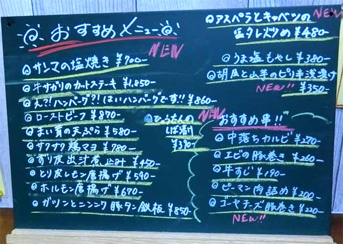 | ピーマン肉詰:200円 豚シソ巻:200円 うずらベーコン:180円 有頭海老:180円 サンマの塩焼:700円 | ||||||||||||||||||||||