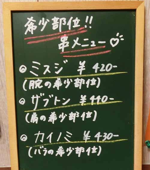 | ズリ:120円 やげん:150円 とりみ:180円×2 せせり:200円 豚えのき巻:200円 豚レタス巻:200円 豚小ねぎ巻:200円 豚シソ巻:200円 | ||||||||||||||||||||||