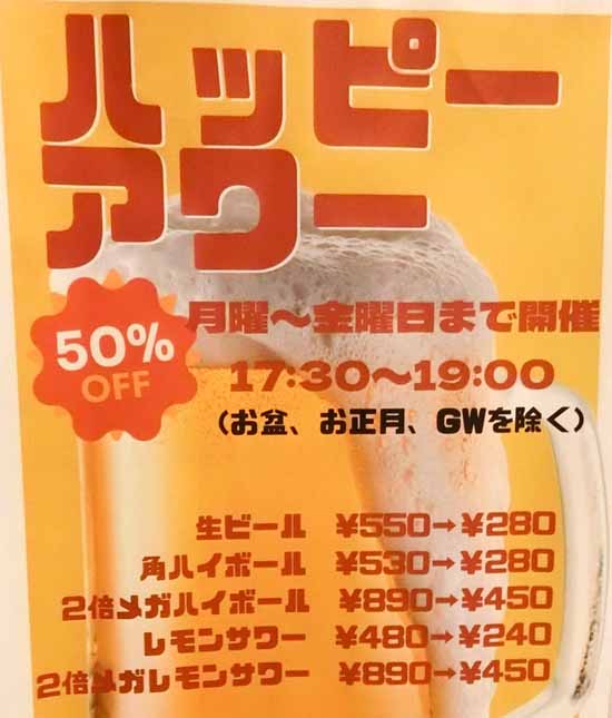 | 生ビール:550円→280円 デカレモンサワー:890円→450円 メガハイボール:890円→450円 | |