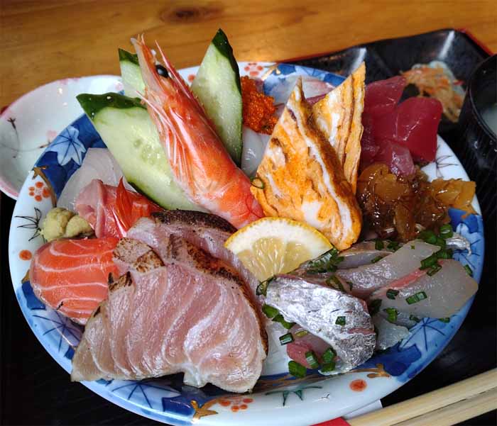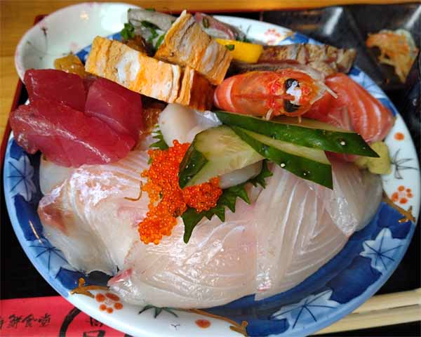 有頭海老、まぐろ、サーモン、タイ、ハマチ、ホタテ、アジ、とびこ、松前漬、玉子焼![]() |