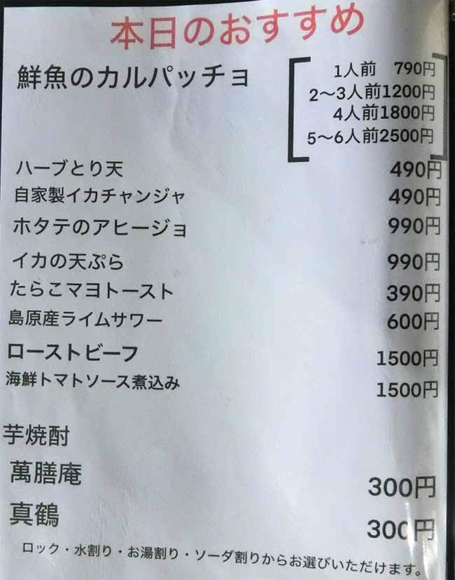 | 鮮魚のカルパッチョ/2-3人前:1200円 | |