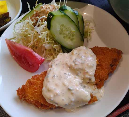 | うどん定食B:750円(税込) (うどん、白身フライ、ご飯、サラダ、漬物) |