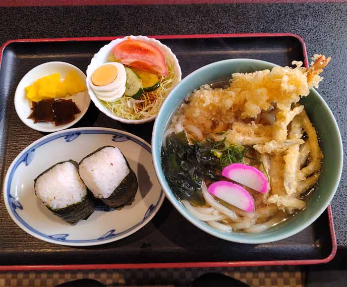 | 天ぷらうどんセット:900円(税込) (天ぷらうどん、おにぎり、サラダ、漬物) |
