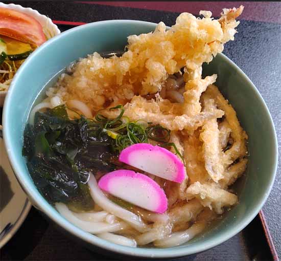 | 天丼セット:1100円(税込) (うどん、天丼、サラダ、漬け物) |