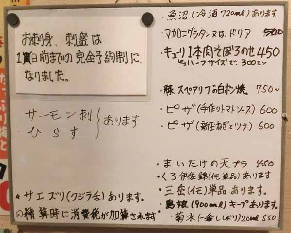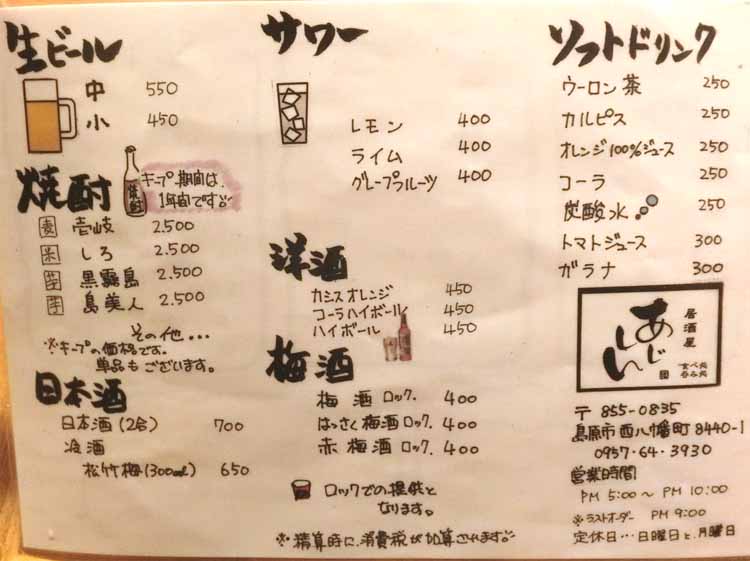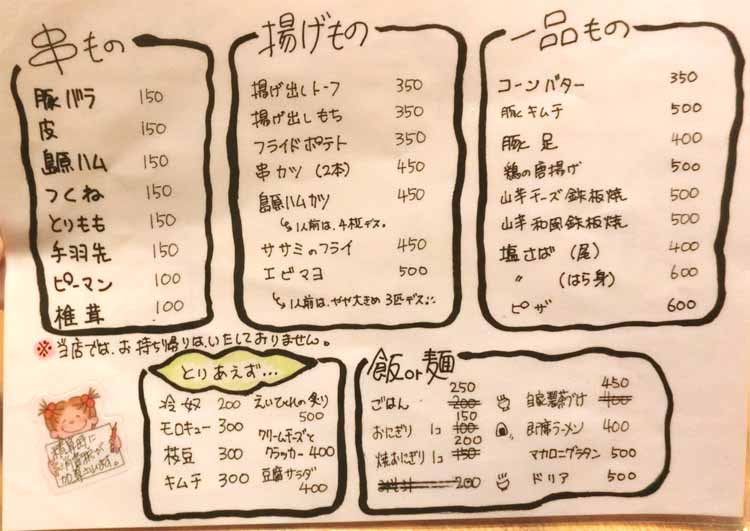 | 生ビール:550円 サワー:400円 烏龍茶:250円 焼酎お湯割り | ||||||||||||||||