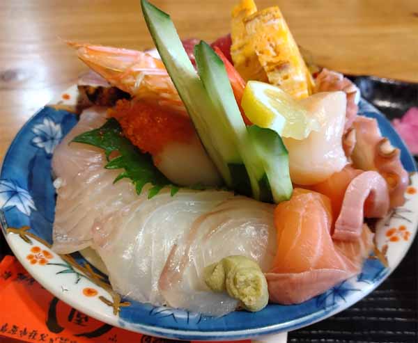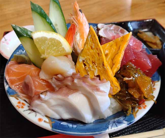 有頭海老、まぐろ、サーモン、タイ、ハマチ、ホタテ、アジ、とびこ、松前漬、玉子焼![]() |