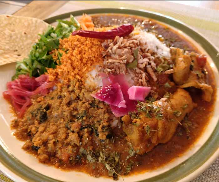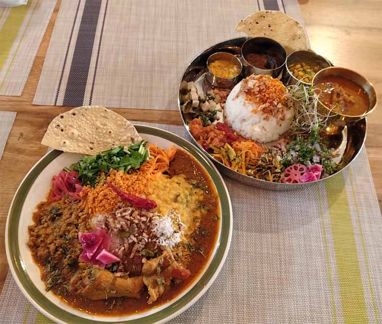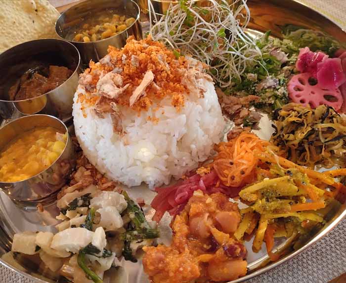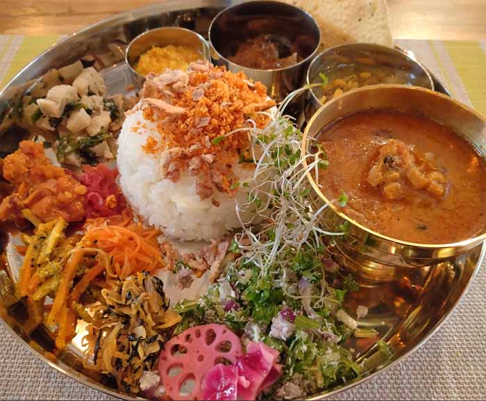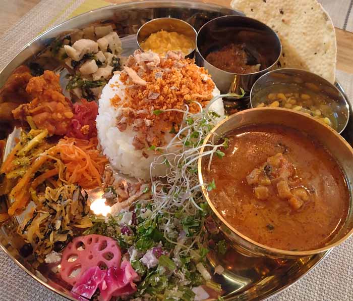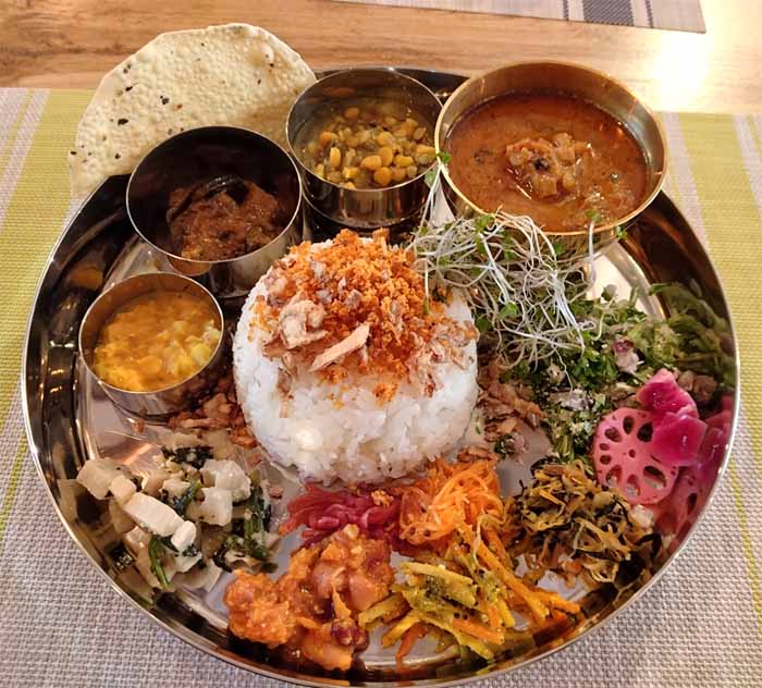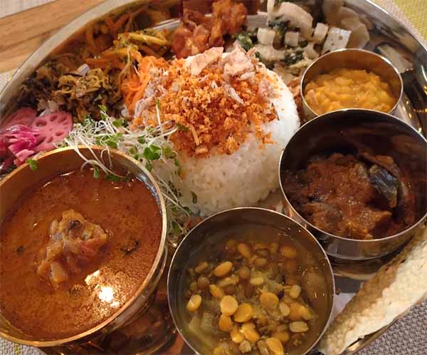 チキンカリー/ホウレン草キーマ/パリップ豆カリー/玉ねぎ人参アチャール/ポルサンボル/パパド![]() |