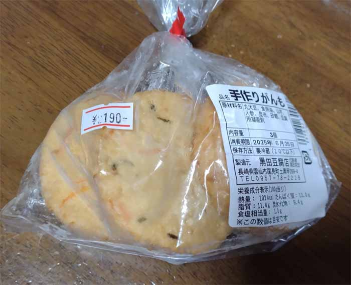 | 手作りがんも/3個:190円 黒田豆腐店(雲仙市国見町土黒甲269-4) |