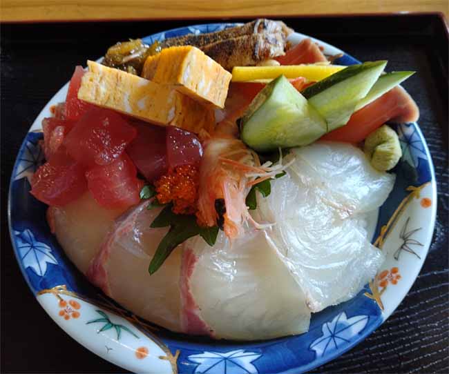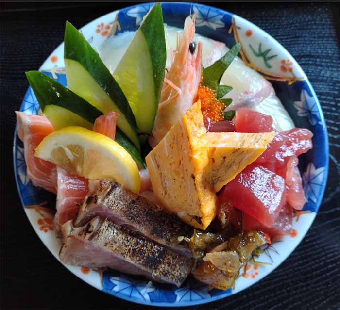 有頭海老、まぐろ、サーモン、タイ、ハマチ、アジ、とびこ、松前漬、玉子焼![]() |