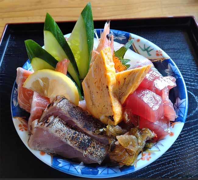 有頭海老、まぐろ、サーモン、タイ、ハマチ、ホタテ、カツオ、タコ、とびこ、松前漬、玉子焼 ![]() |