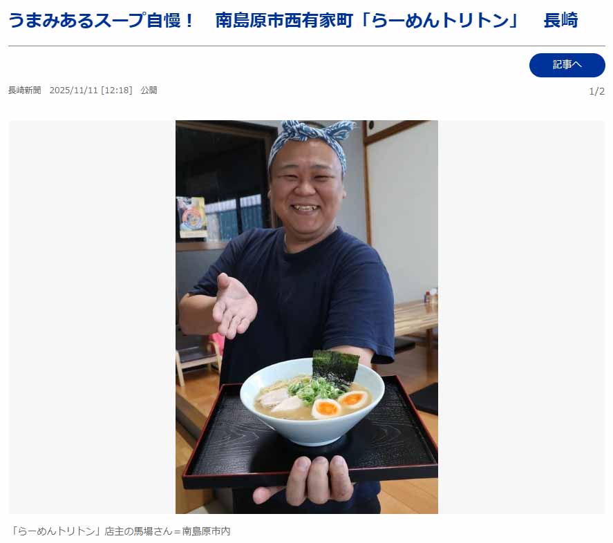 うまみあるスープ自慢!南島原市西有家町「らーめんトリトン」![]() https://www.nagasaki-np.co.jp/kijis/?kijiid=3358a51cacb3437fbf7985cb6e0d28a8 |