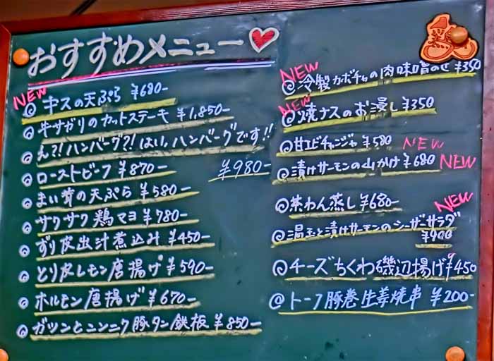 | ピーマン肉詰:200円 豚シソ巻:200円 うずらベーコン:180円 有頭海老:180円 サンマの塩焼:700円 | ||||||||||||||||||||||