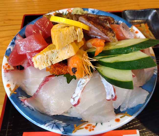 有頭海老、まぐろ、サーモン、タイ、ハマチ、カツオ、とびこ、松前漬、玉子焼![]() |