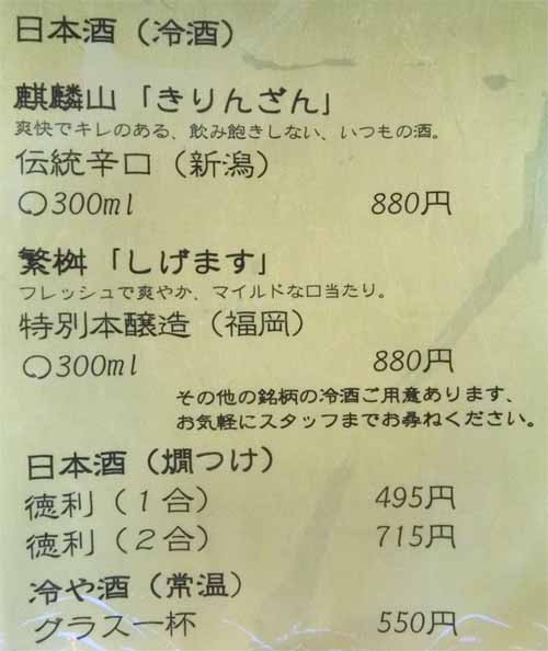| 生ビール/中:550円 オレンジ:385円 繁桝/特別本醸造(福岡)300ml:825円 | |