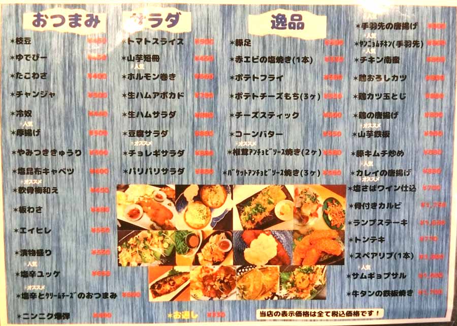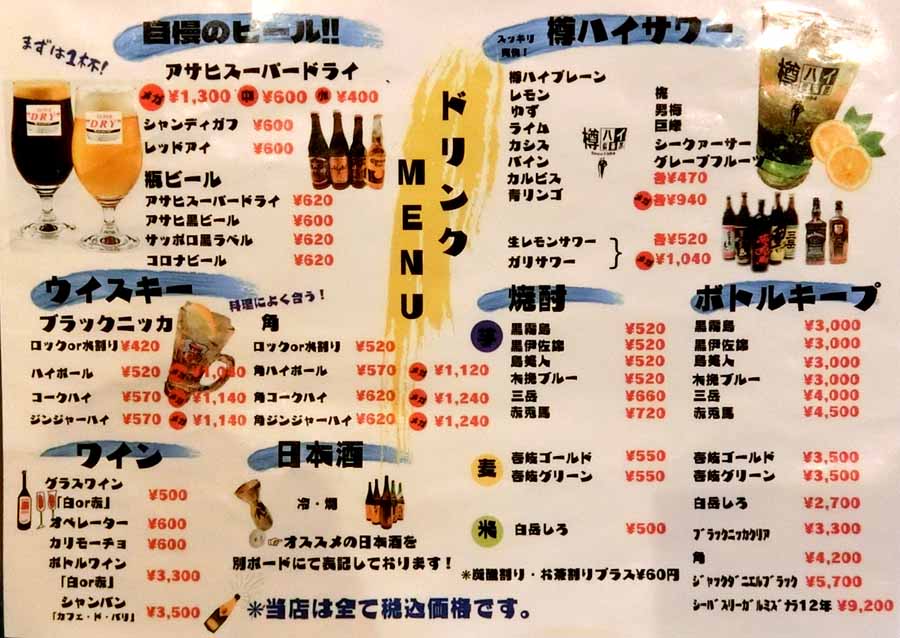 | 生ビール:600円 ガリサワー(酎ハイ):520円 木挽ブルー:3000円 | |