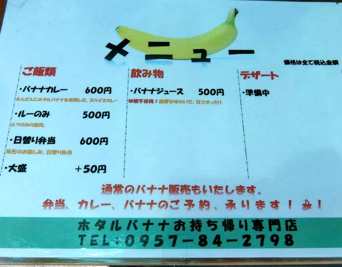| 南島原市北有馬町丙3437-1 電話:0957-84-2798 11:00〜14:00 休:日曜、不定休 20240417OPEN https://www.instagram.com/hotarubanana/ |