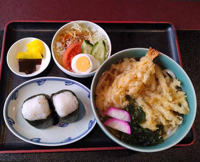 | 天ぷらうどんセット:900円(税込) (天ぷらうどん、おにぎり、サラダ、漬物) |