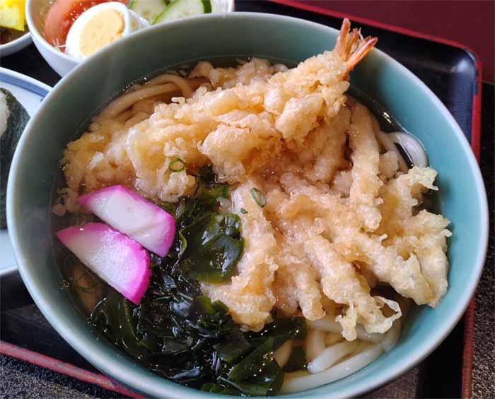 | 天丼セット:1100円(税込) (うどん、天丼、サラダ、漬け物) |