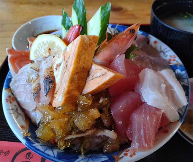 有頭海老、まぐろ、サーモン、タイ、ハマチ、カツオ、エンガワ、とびこ、松前漬、玉子焼![]() |