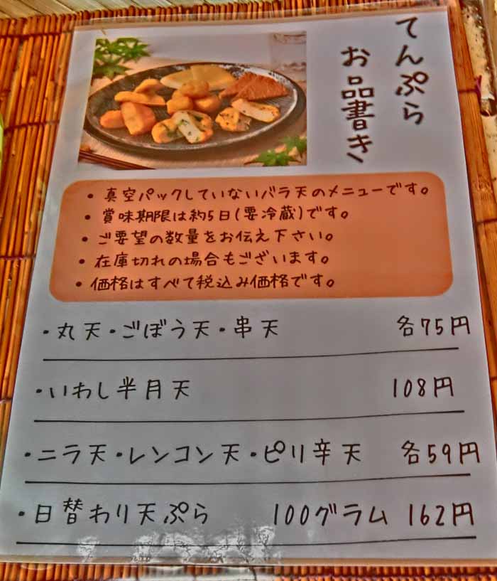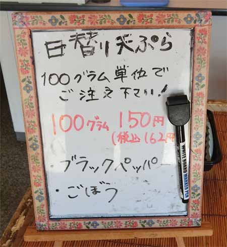 | 日替り天ぷら:カレー・いわし 100g/150円/税込162円 | |||||||||||||||||