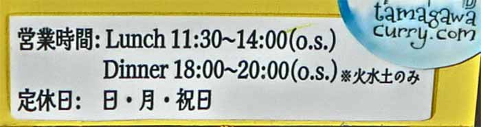 | 福岡市南区清水1丁目24-18 電話:080-3376-4382 11:30〜14:00/18:00〜L.O.20:00 休:日曜/月曜/祝日/木曜夜/金曜夜 https://tamagawa-curry.locaop.site/ https://www.instagram.com/tamagawa_curry/ |