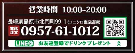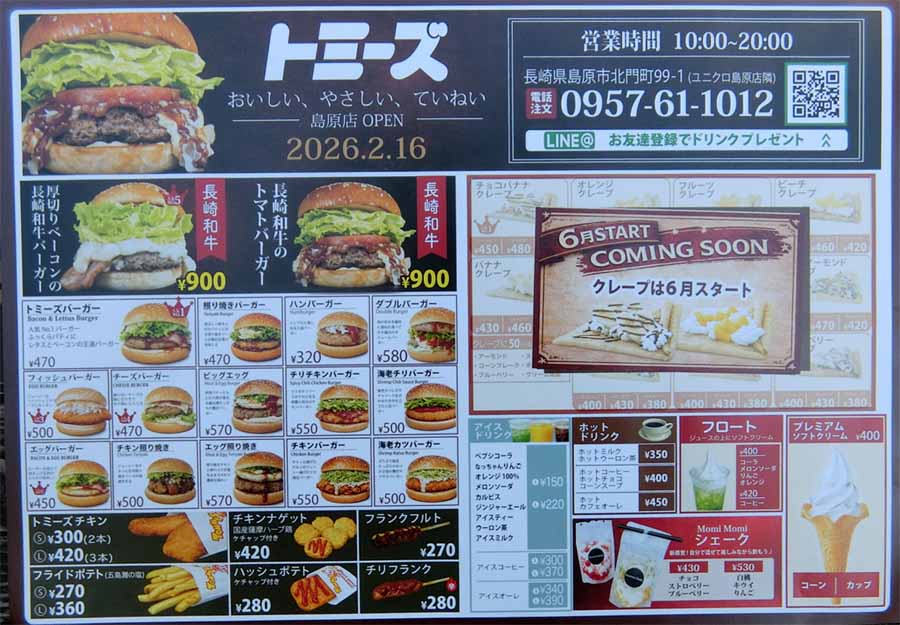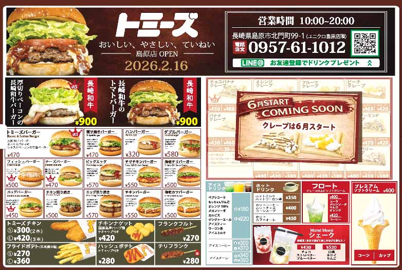 | 島原市北門町99-1 電話:0957-61-1012 10:00〜20:00 https://www.instagram.com/tommys_shimabara/ https://www.tommys1981.com/ |
