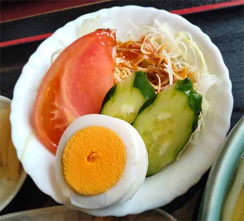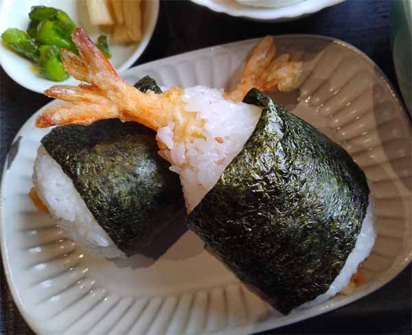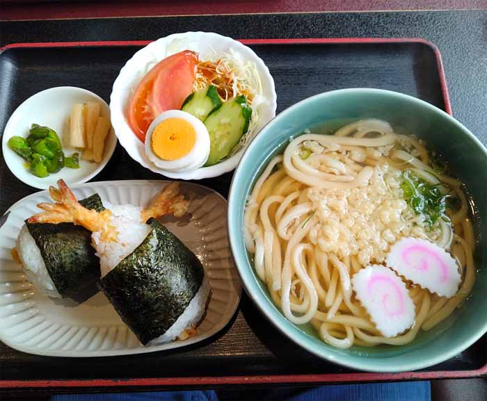| 天むすセット:950円(税込) (うどん、天むす、サラダ、漬物) |