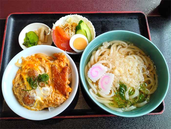 | カツ丼セット:980円(税込) (うどん、カツ丼、サラダ、漬物) |